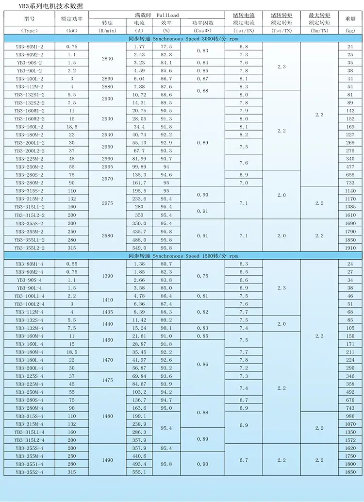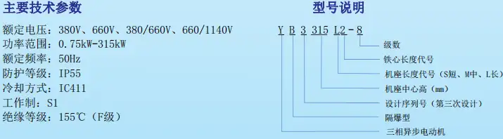 YB3系列隔爆型三相异步电动机是YB2系列的更新换代,隔爆性能符合GB3836.1-2010《爆炸性环境第1部分:设备 通 用要求》、GB3836.2-2010《爆炸性环境 第2部分:由隔爆外壳“d”保护的设备》的规定,按/T7565.1-2011标准制造。防爆标志ExdⅡBT4。