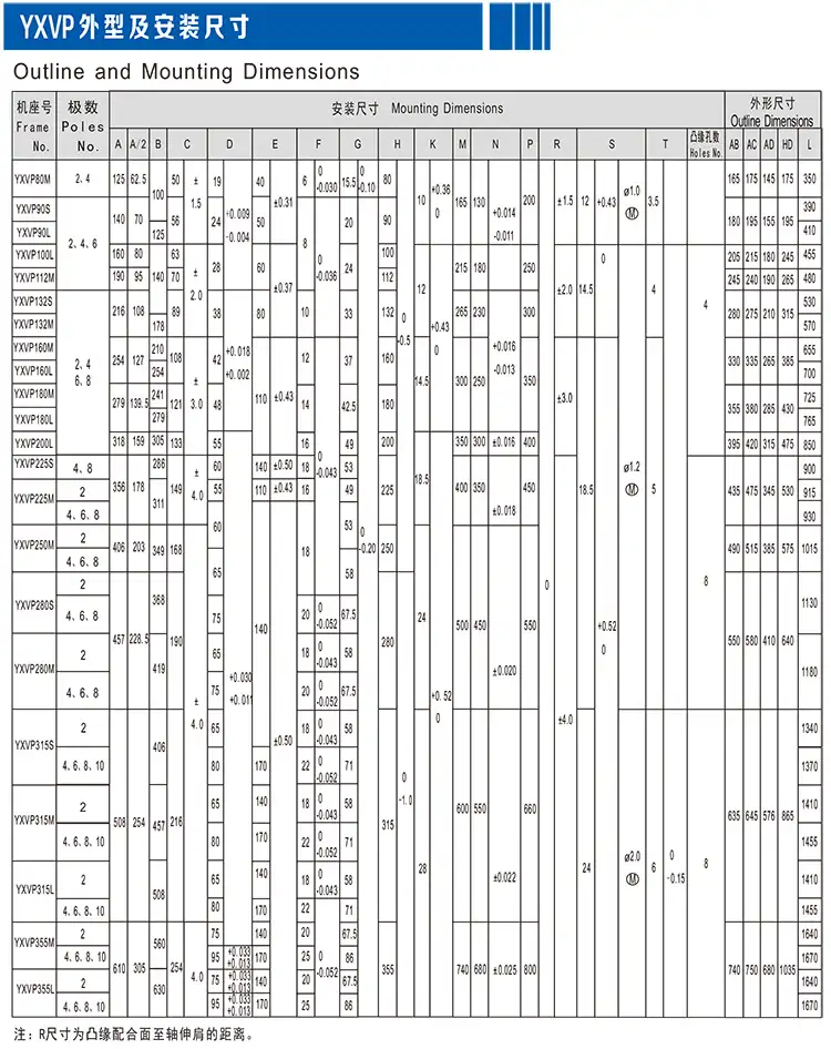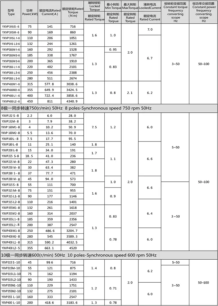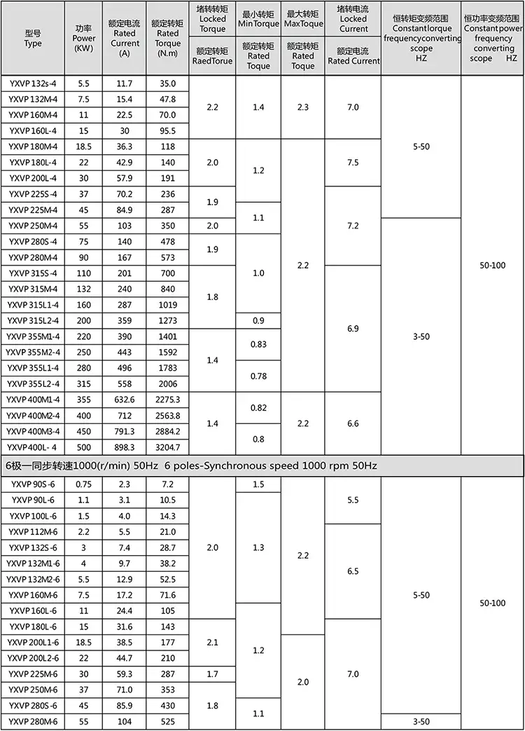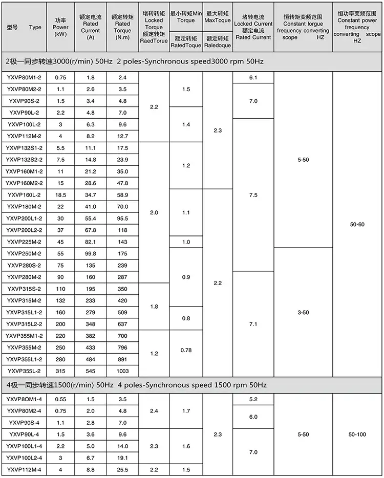 YXVP系列电动机是经过特殊设计的与异步交频器配套使用的交流安场无级调电机,可在变频电源下工作,分带编码器的和不带编码器的两种。该系列产品调速范围宽,在5-50Hz范围内作恒转矩变频调速运行,在50-100z范围内作恒功率变频调速运行,运行平稳,转矩脉动小,根据使用要求,可安装独立的风扇冷却装置,使电机在不同转速下均有较好的冷却效果。电机带编码器时起动更平稳,控制更好。